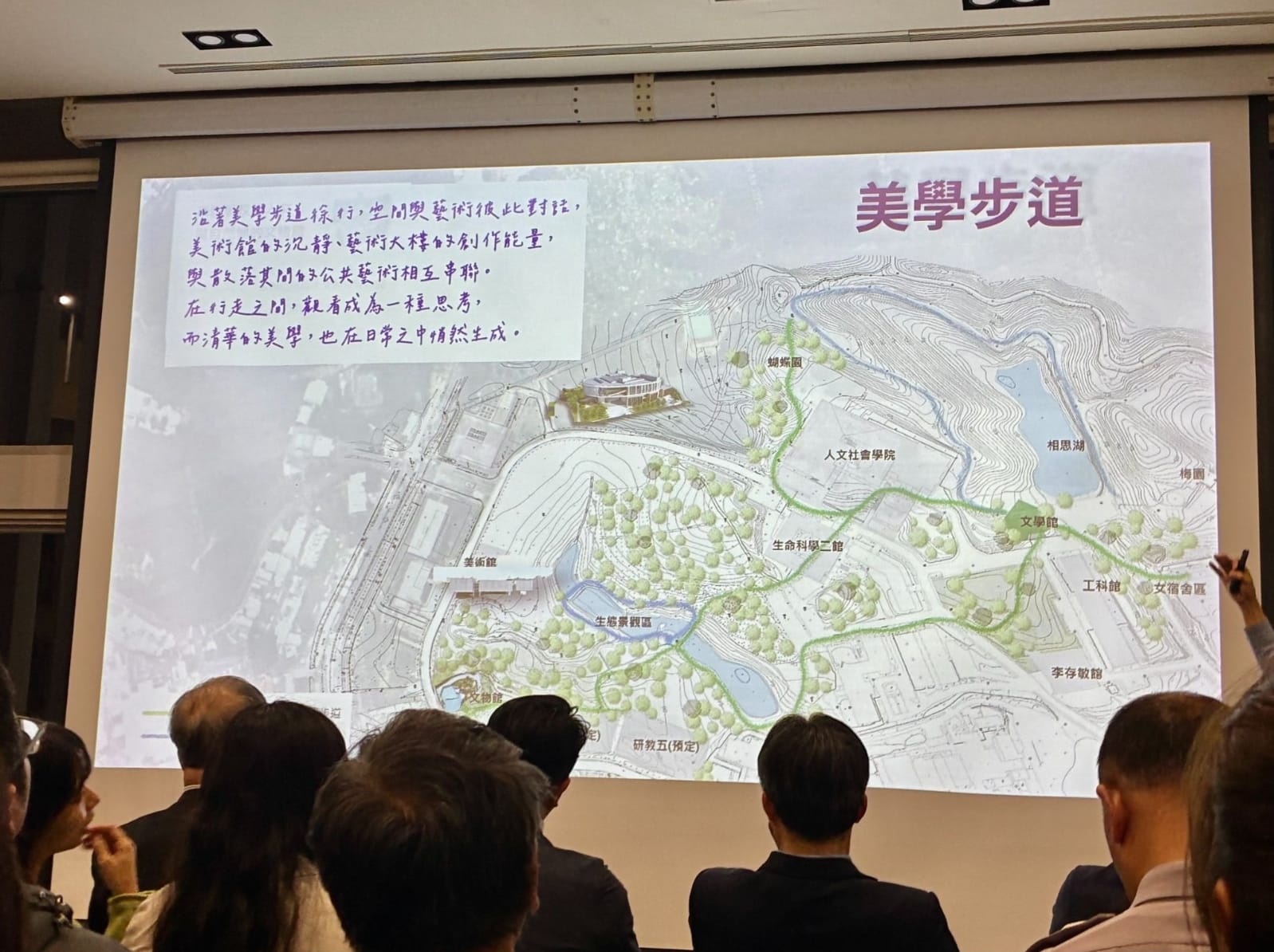 此外,簡報中亦提出未來將規劃「美學步道」與「生態步道」之路線圖,但經比對後發現部分路線仍存在疑問,例如生科二館至奕園之間目前並無實際步行路線,而人社院至蝴蝶園之間路段亦包含柏油停車場空間。因此,相關步道分類是否涉及後續整體步行空間規劃,仍值得持續關注。