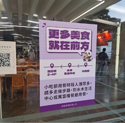 而校本部的生活空間,也有人有變得「很擠」的感受。以學餐為例,在用餐時段小吃部因人潮眾多,難以找到座位,因此,總務處經管組有新增「更多美食就在前方」的公告(圖五),建議同學多走幾步路,到水木生活中心或風雲樓用餐。然而,在中午用餐時,就算走到了風雲樓,仍可能面臨找不到座位的窘境。